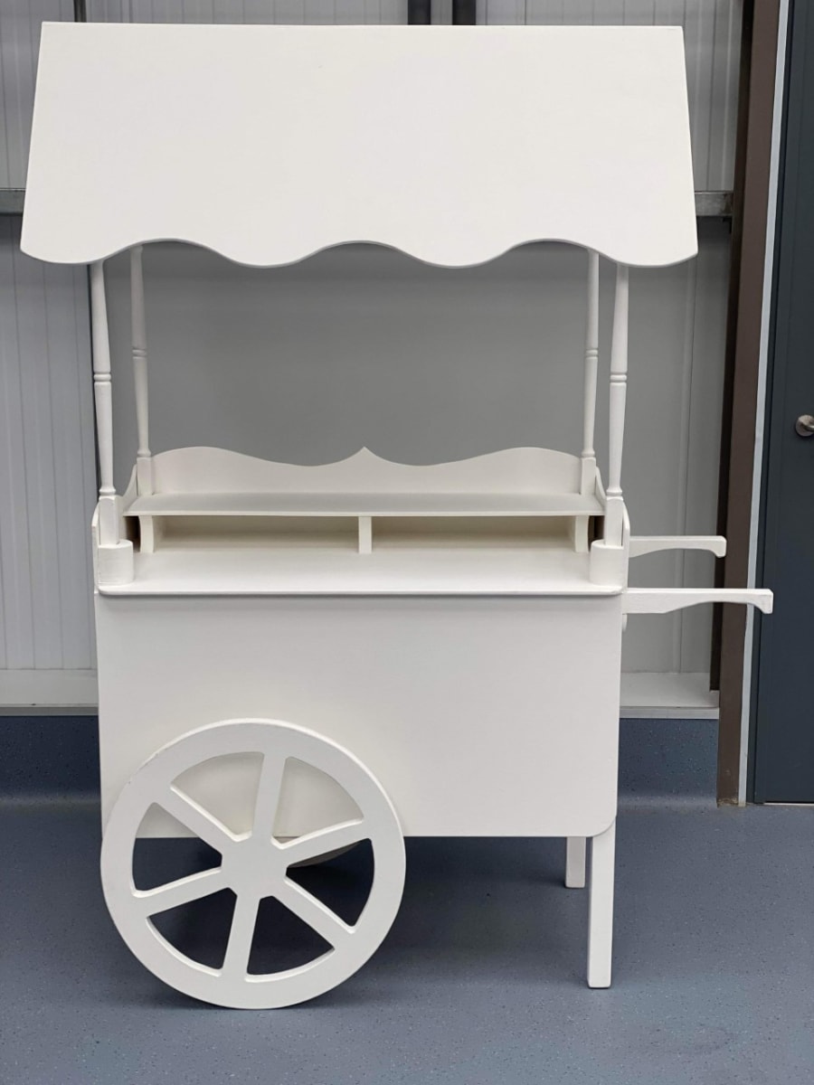 Our white retro sweet cart will add a little fun factor to your party and keep the children and adults fueled for all the fun you have planned for the day. (Please note decorations used in picture are examples only and are not supplied)